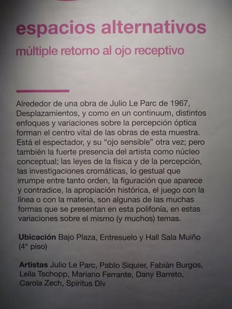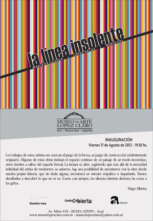 “Esta exposición se propone transitar la rica diversidad de las manifestaciones geométricas desarrolladas a partir de los años setenta, atendiendo a sus cualidades plásticas, sus ideas motoras, sus aportes al medio pictórico y su amplia pluralidad en la producción actual”